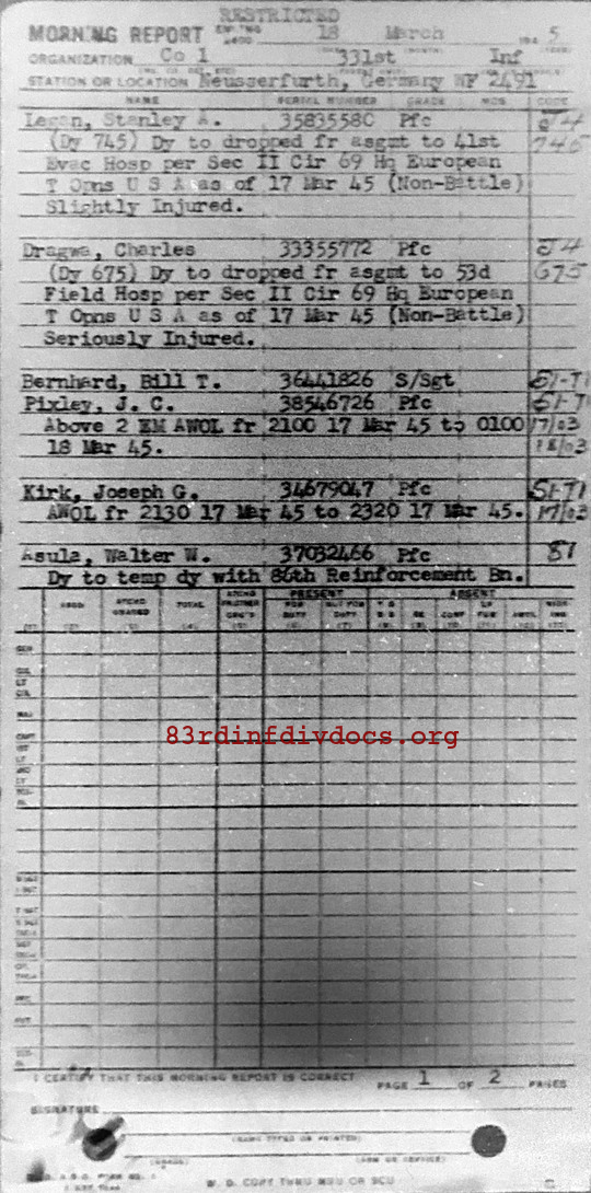 Returned to duty from 86th Reinforcement Battalion on March 15, 1945 |