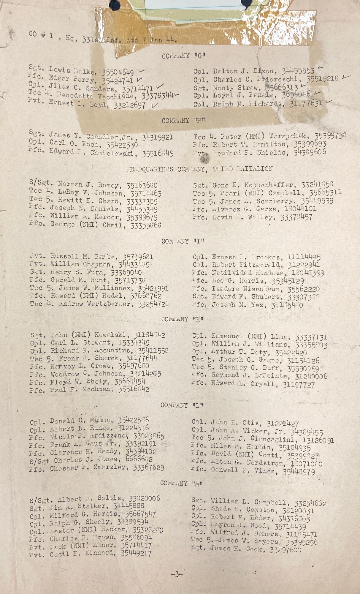 | 1944-10-08 | PFC | Assigned and joined from 53rd Replacement Battalion as of October 8, 1944 | 745 | L / 331 | view page |