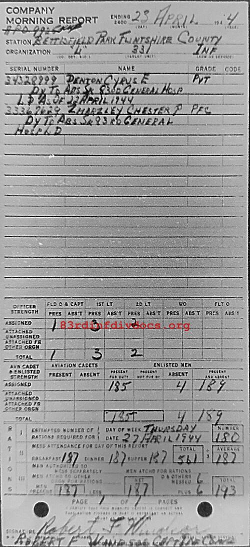 | 1944-04-23 | PFC | Non battle casualty and duty to 83rd General Hospital on April 23, 1944 | L / 331 | view page | |