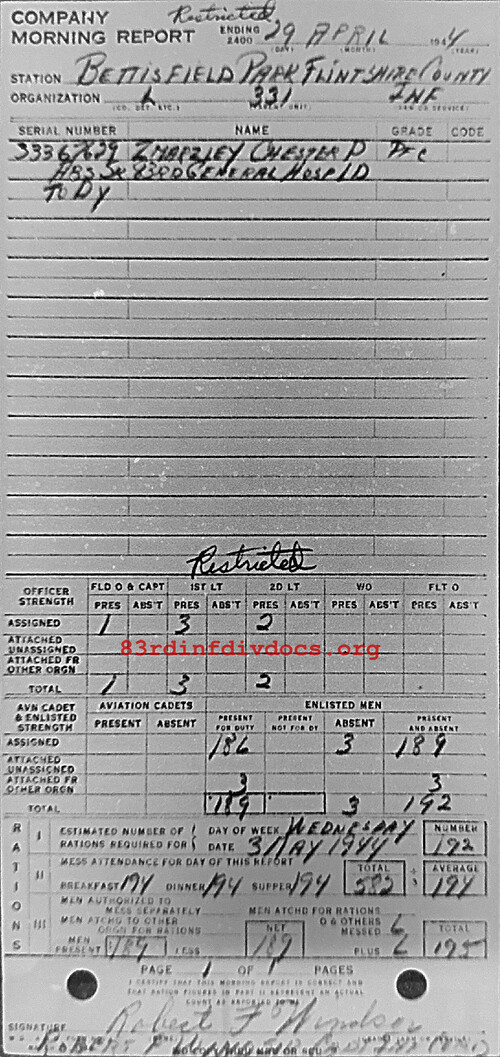 | 1944-04-29 | PFC | Returned to duty from 83rd General Hospital on April 29, 1944 | L / 331 | view page | |