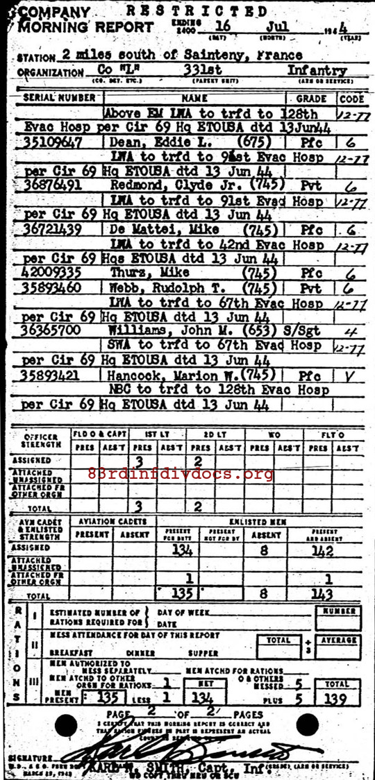 | Private First Class Zmarzley was a member of L Company. The morning report for July 16, 1944 on pages 23 and 24 show him listed was Wounded in Action and transferred to the 128th Evacuation Hospital. Since we have no later records on Pfc Zmarzley we assume that he was Killed in Action while serving in L Company. The pages can be seen below. |