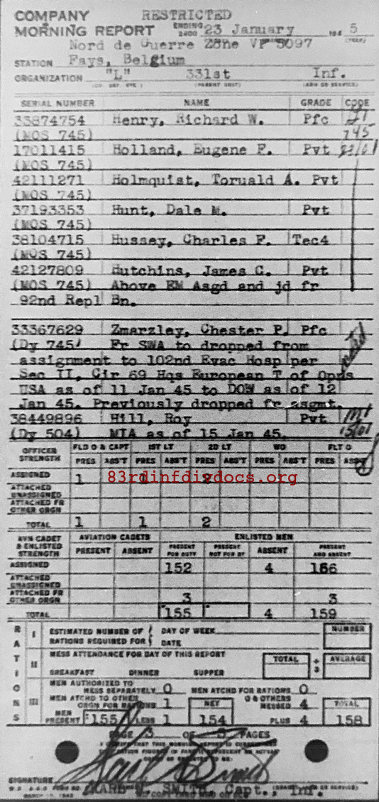 | 1945-01-23 | PFC | Severely wounded in action and transferred to 102nd Evacuation Hospital on January 11, 1945 | 745 | L / 331 | view page |