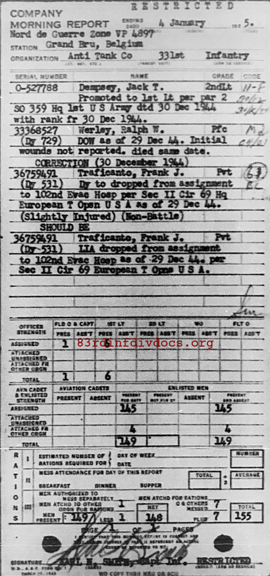| The 331st Casualty Report (page 2, #41) for 1944 lists Pfc. Werley as member of AT Co. |