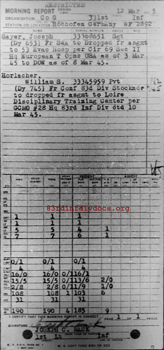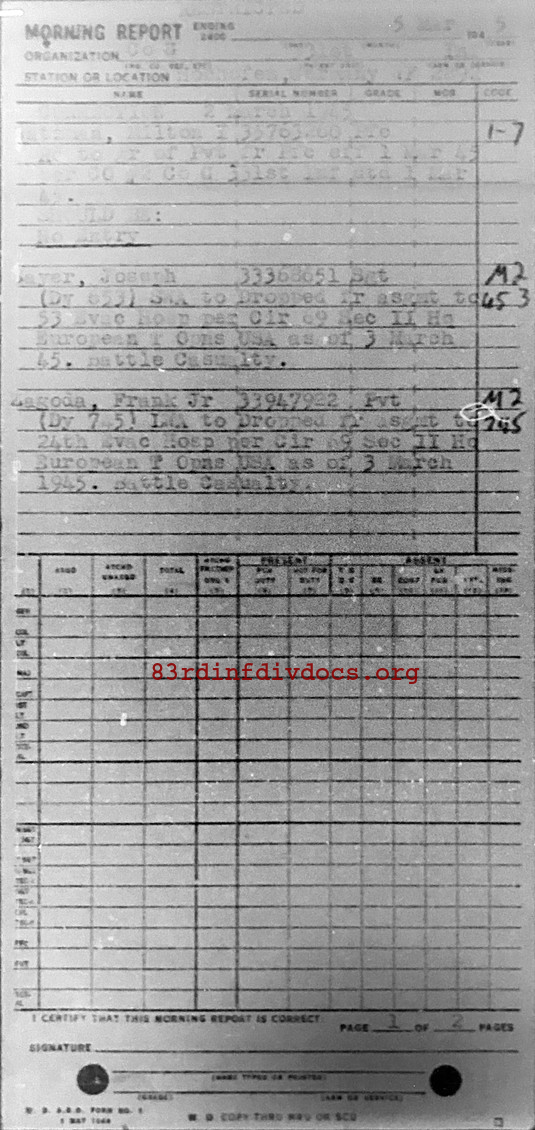 | 1945-03-05 | SGT | Severely wounded in action and transferred to 53rd Evacuation Hospital on March 3, 1945 | 653 | G / 331 | view page |