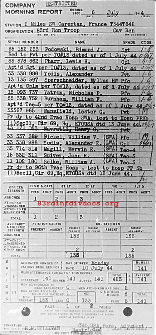 | Listed in HQ 83rd Reconnaissance Troop, History 1944 as killed in action on December 10, 1944 as a Sergeant in 83RCNTRP. | 3 | ||||