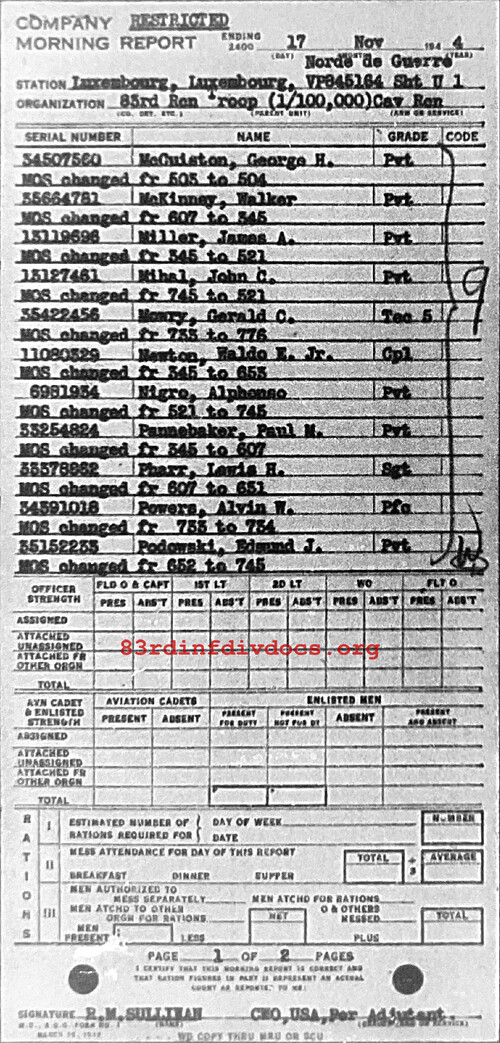 | 1944-11-17 | SGT | Duty changed to Platoon Sergeant (651) as of November 17, 1944 | 607 | 83RCNTRP | view page |