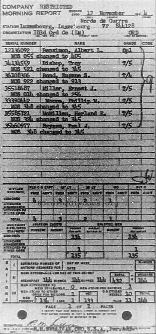 | 1944-11-17 | TEC5 | Duty changed to Truck Driver Light (345) as of November 17, 1944 | 348 | C / 783ORD | view page |