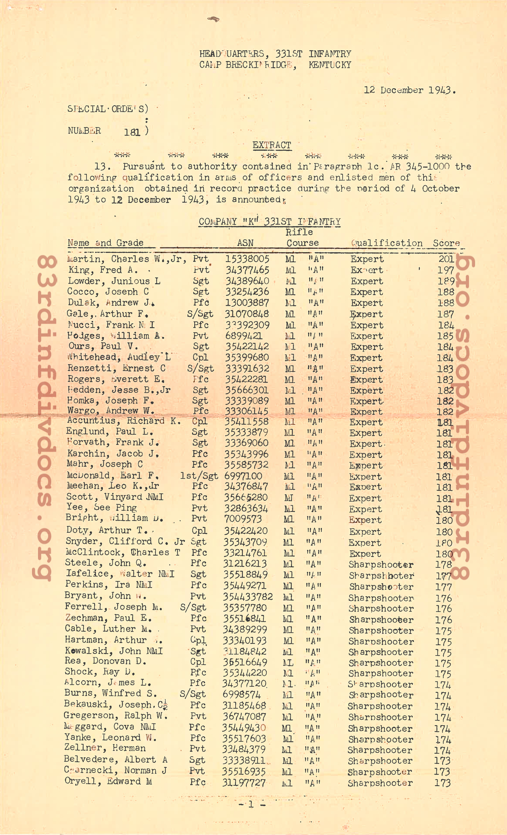 | Listed in HQ 331st Infantry Regiment, SO 1943 #181: Rifle course M1 'A' marksmanship qualification of 'Expert' with a score of 183 as a Staff Sergeant in K/331 | View page | ||||
