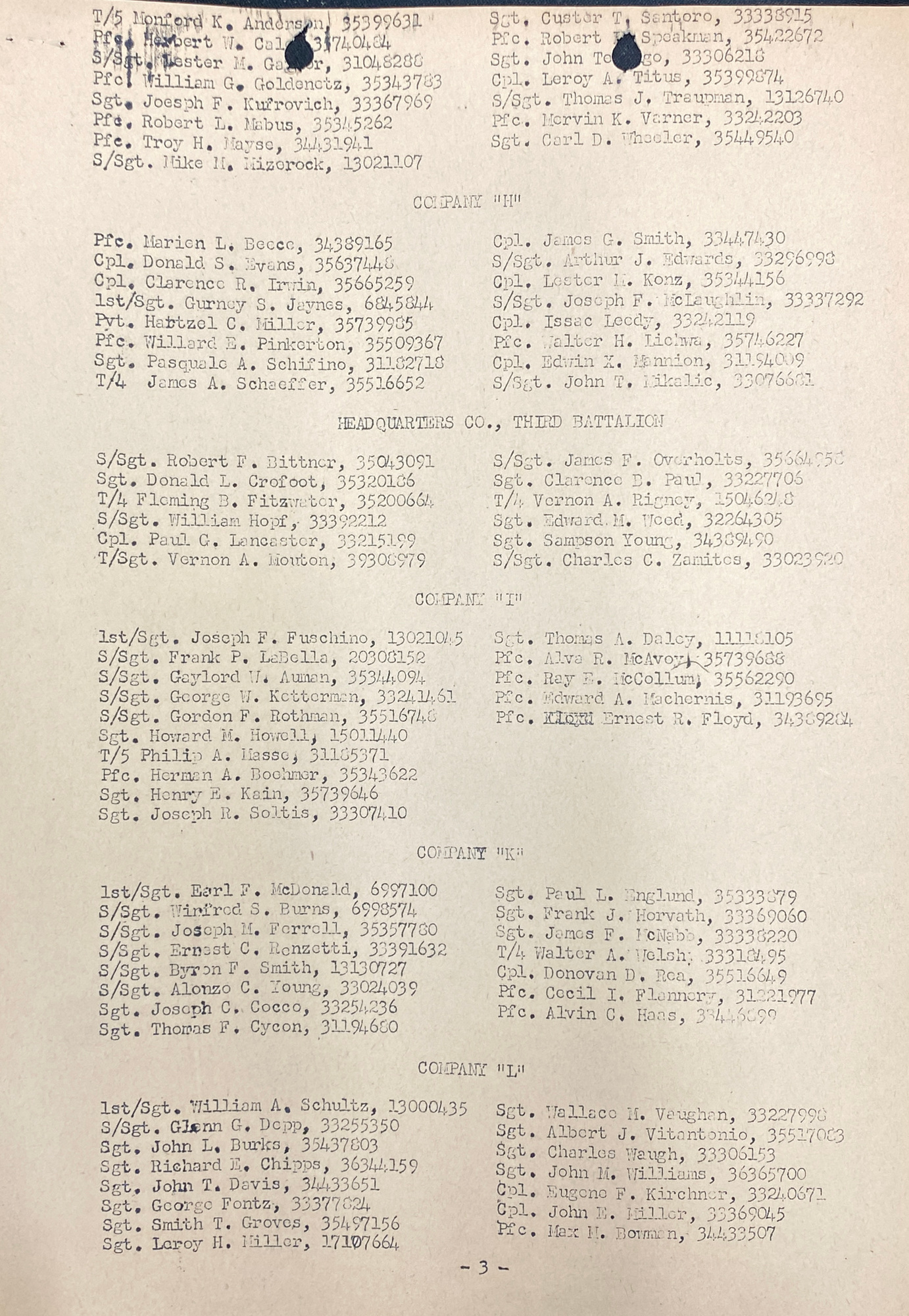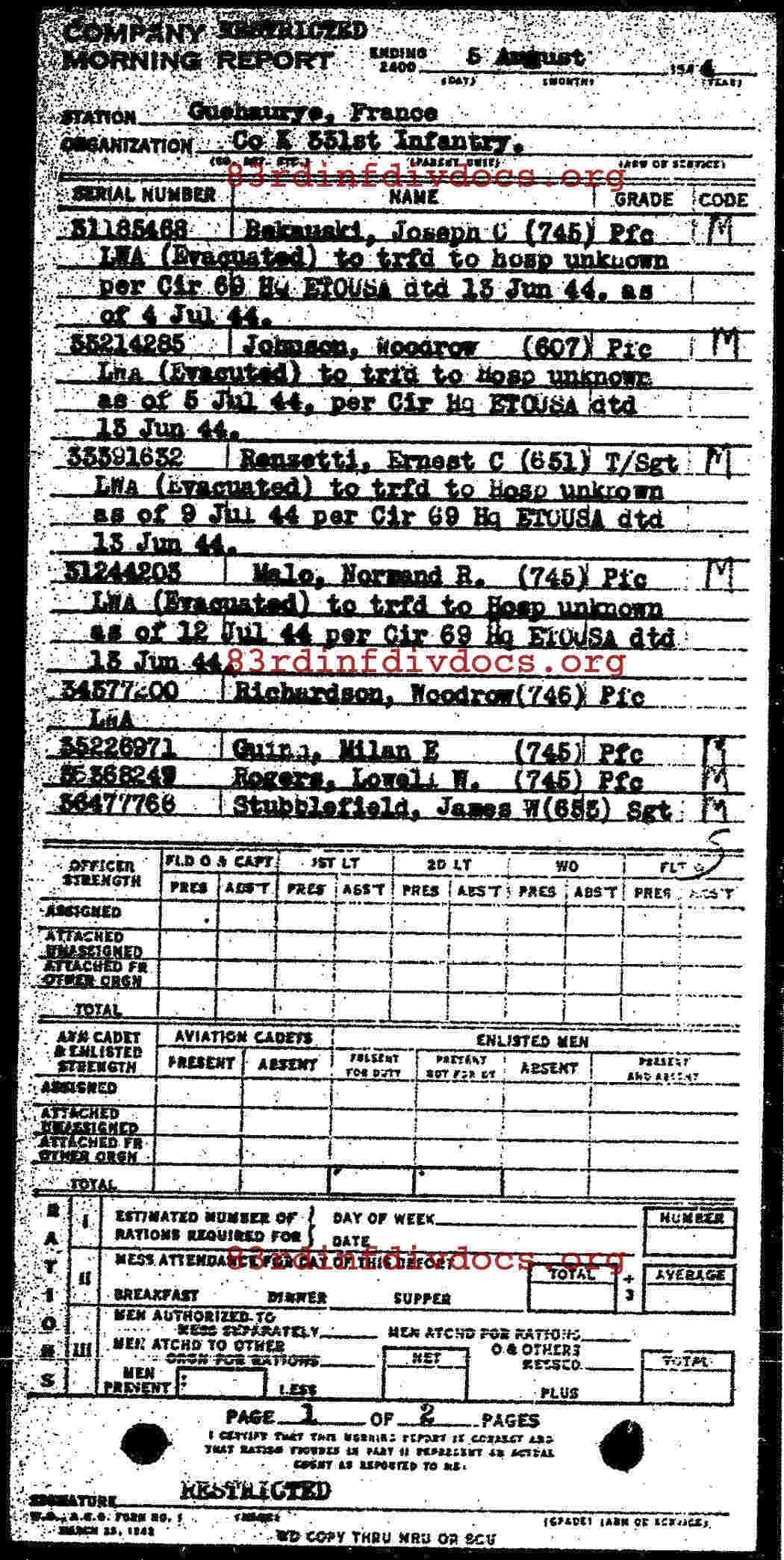 | 1944-08-05 | TSGT | Lightly wounded in action and transferred to unknown hospital on July 9, 1944 | 651 | K / 331 | view page |