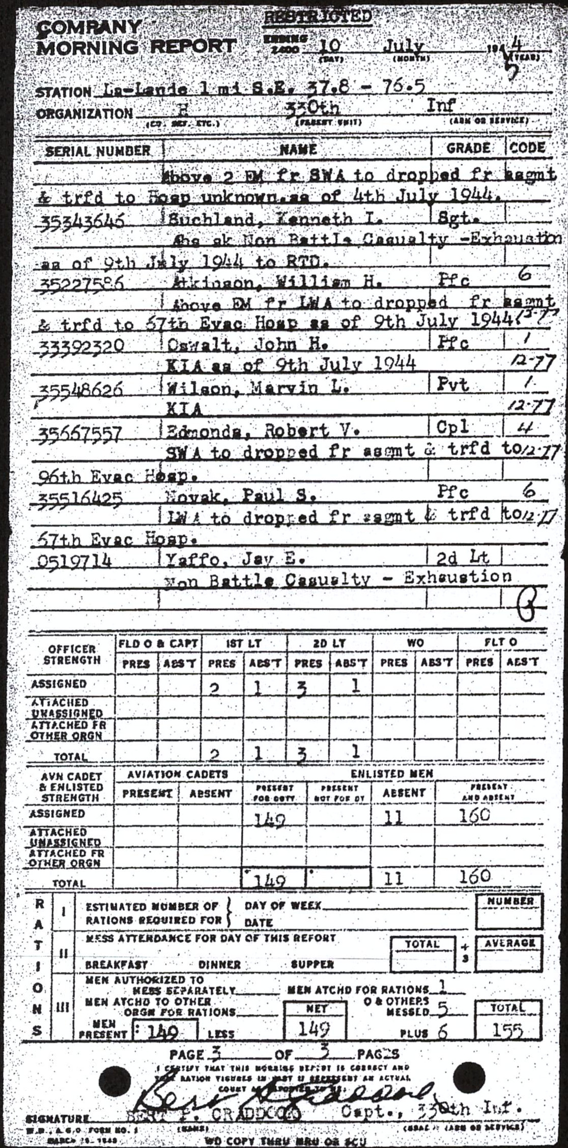 | Private First Class Oswalt was a member of H Company. The morning report for July 10, 1944 on page 13 lists him as killed on action on July 9, 1944. The page can be seen below. |