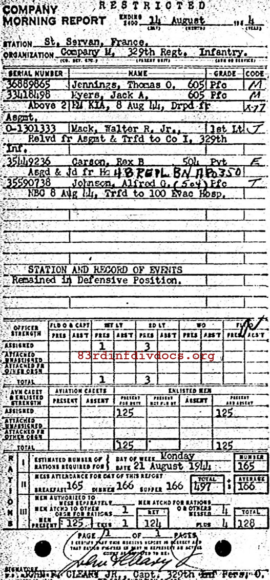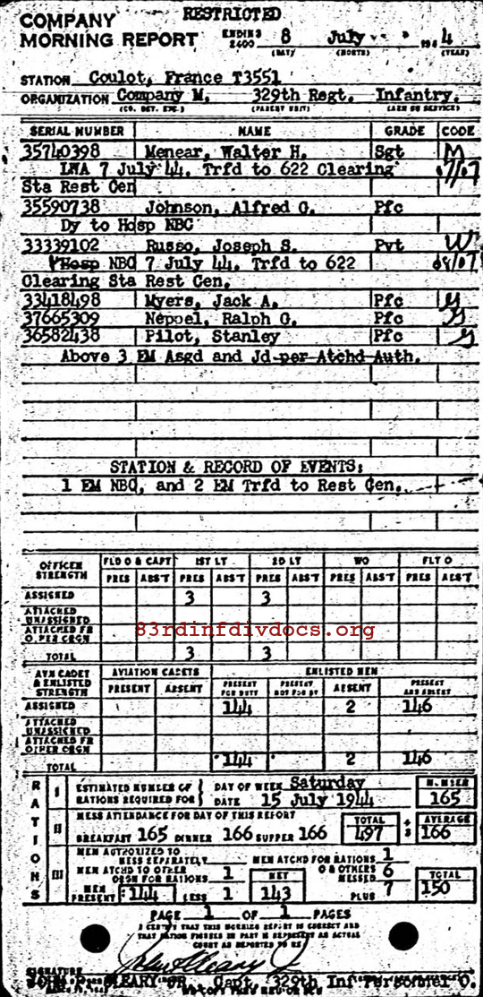 | Private First Class Myers was a member of M Company. The morning report for July 8, 1944 on page 9 lists him joining M Company per special order #99 as a heavy machine gunner together with Private First Class Neppel who later earned a Medal of Honor. The morning report for August 14, 1944 on page 14 lists him as killed in action on August 8, 1944. Page 35, for August 27, 1944 corrects this to killed in action on August 13, 1944. |