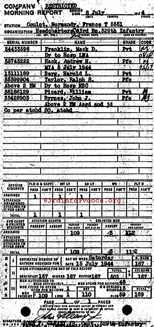 | Private First Class Byrnes was a member of the Headquarters Company, 3rd Battalion. The morning report for July 8, 1944 on page 8 lists him joining the unit per SO #99. Page 22, for July 16, 1944 lists him as missing in action on July 12, 1944. The morning report for August 3, 1944 on page 3 changes his status from missing in action to killed in action on August 12, 1944. All relevant pages can be seen below. |