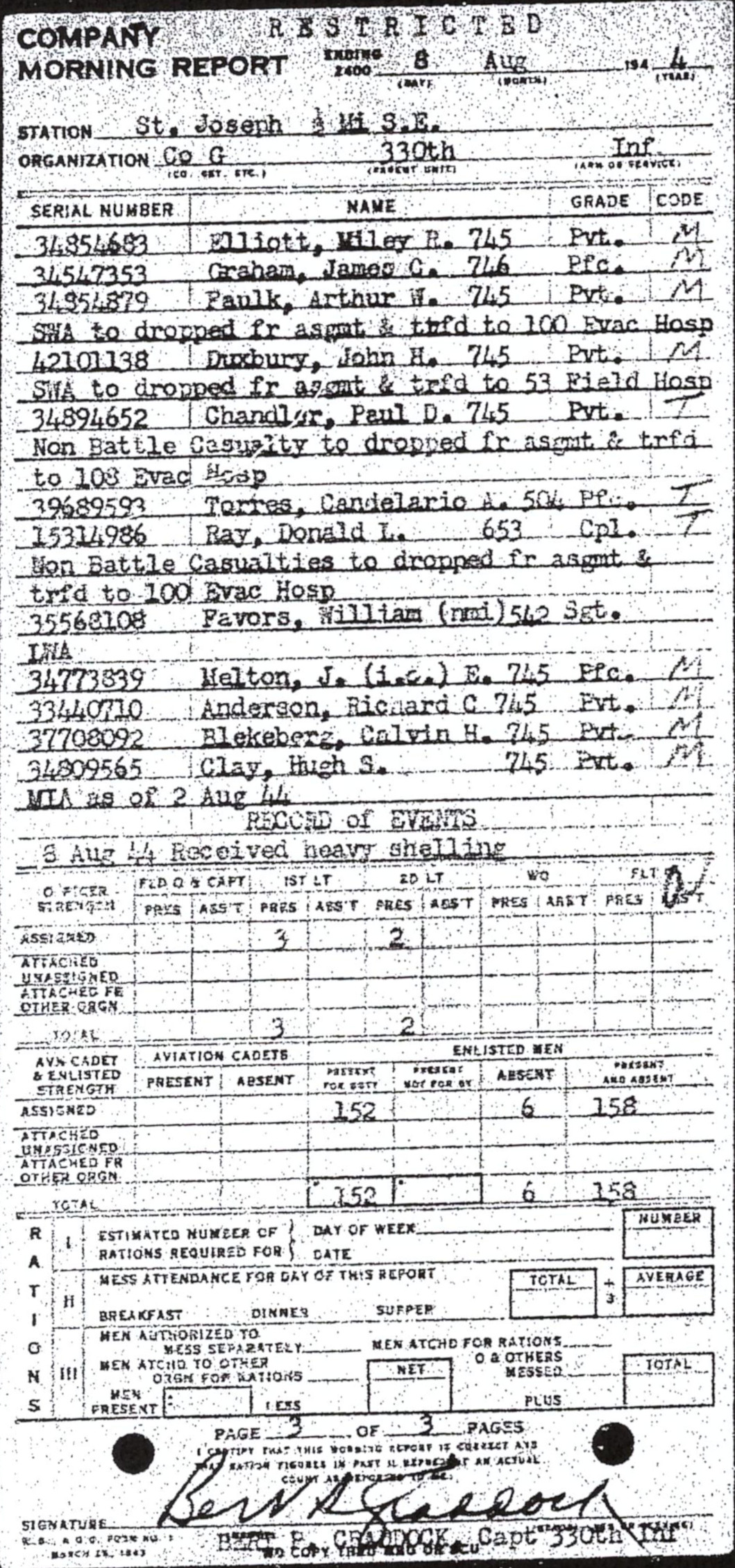 | 1944-08-08 | PVT | Missing in action as of August 2, 1944 | 745 | G / 330 | view page |