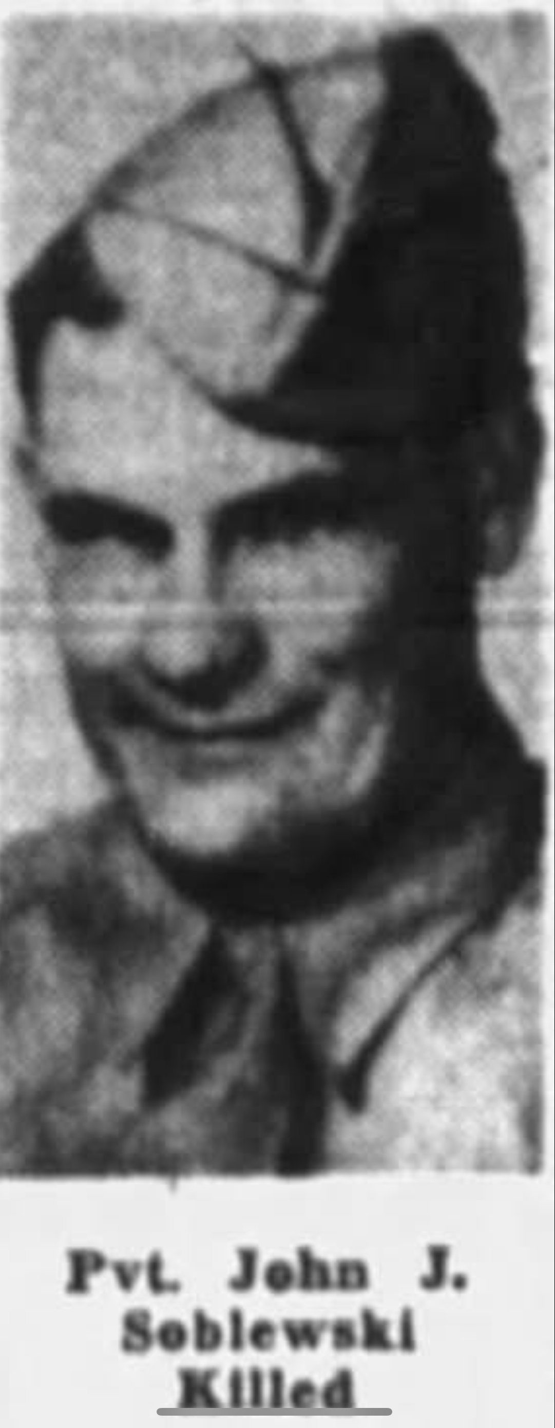 | Private Soblewski was a member of I Company. The morning report for July 9, 1944 on pages 13 and 14 list him joining the unit from the 48th Replacement Battalion on Ju ly 7, 1944. Page 46, for July 26, 1944, lists him as killed in action. The pages can be seen below. |