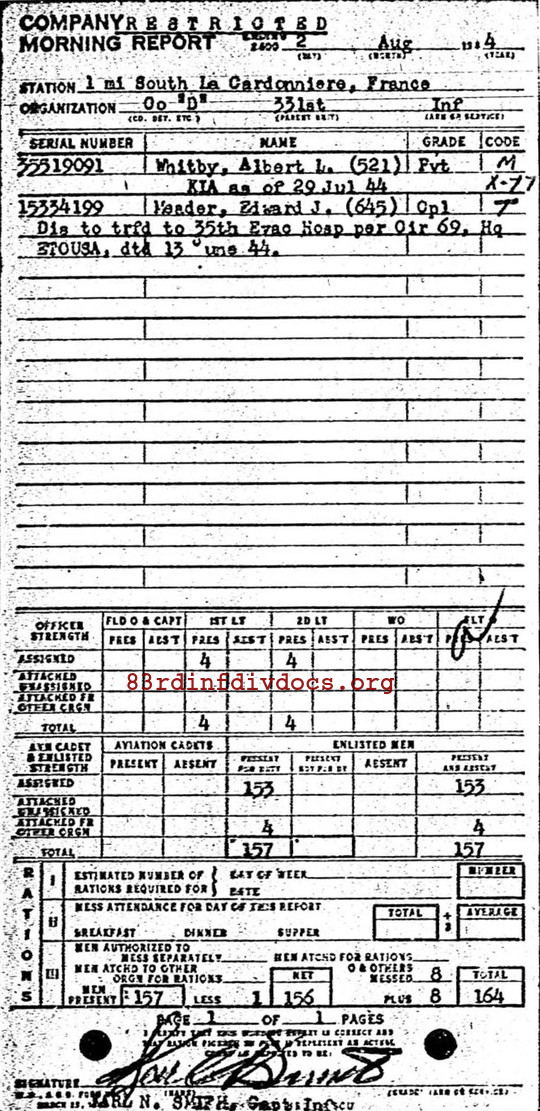 The 331st Casualty Report (page 3, #115) for 1944 lists Pvt. Whitby as member of D Co. The morning report for August 2, 1944 on page 2 shows him killed in action on July 29, 1944. Page 2 can be seen here. |