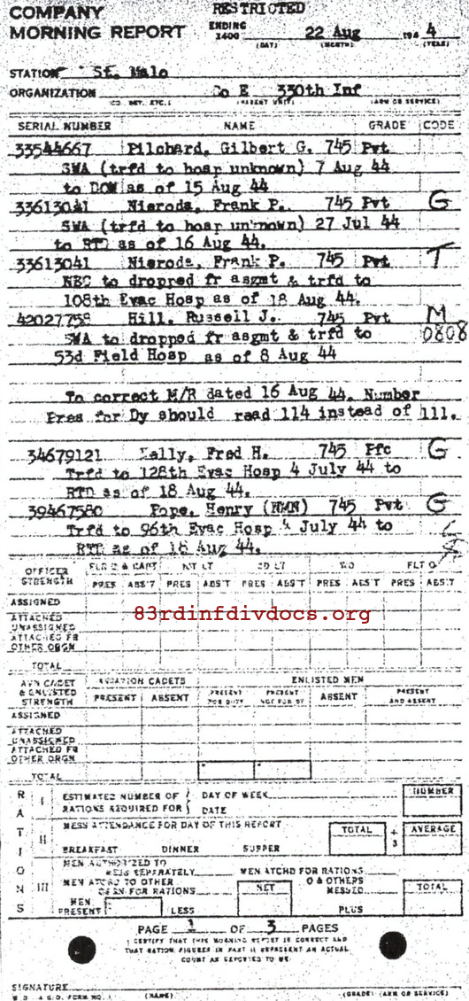 | Private Pilchard was a member of E Company. The morning report for July 26, 1944 on page 55 lists him joining the unit from the 41st Replacement Battalion on July 24, 1944. The morning report for August 13, 1944 on page 22 lists him severely wounded in action and transferred to an unknown hospital on August 7, 1944. The morning report for August 22, 1944 on page 33 lists him as died of wounds on August 15, 1944. The pages can be seen below. |