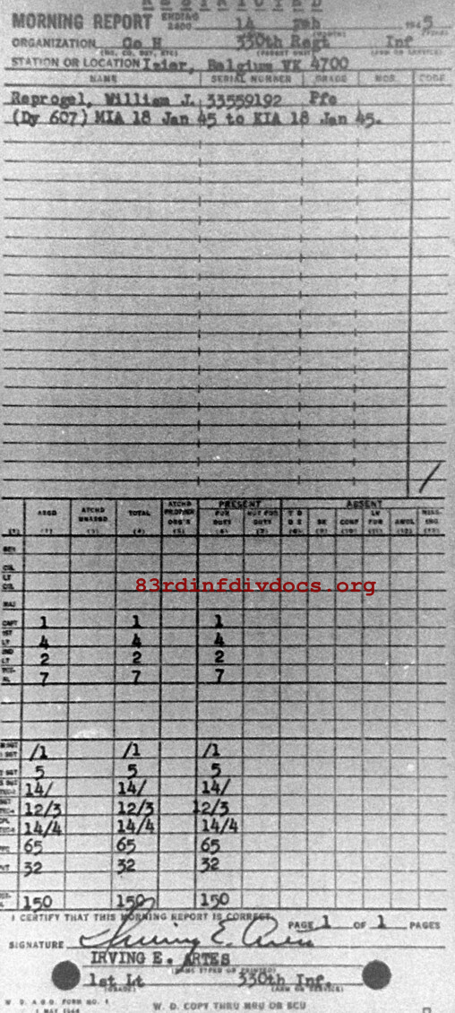 | Private First Class Reprogel was a member of H Company. The morning report for July 19, 1944 on page 27 lists him joining the unit from the 92nd Replacement Battalion on July 11, 1944. Private First Class William Reprogel is the soldier in the middle of the picture. |