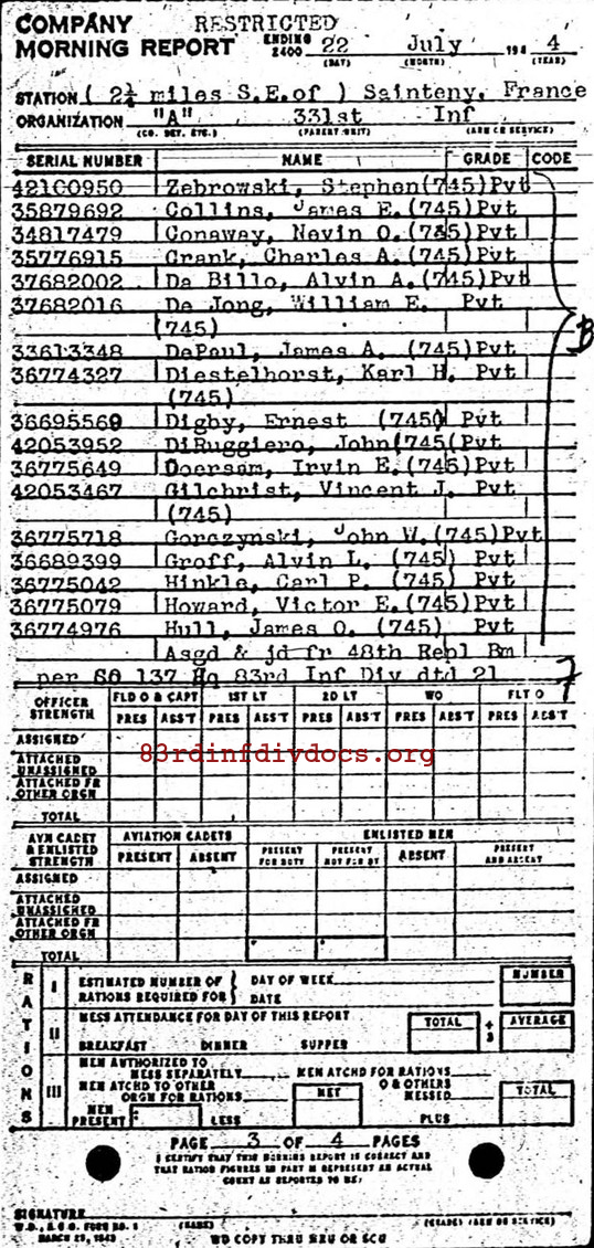 | 1944-07-22 | PVT | Assigned and joined from 48th Replacement Battalion as of July 20, 1944 | 745 | A / 331 | view page |