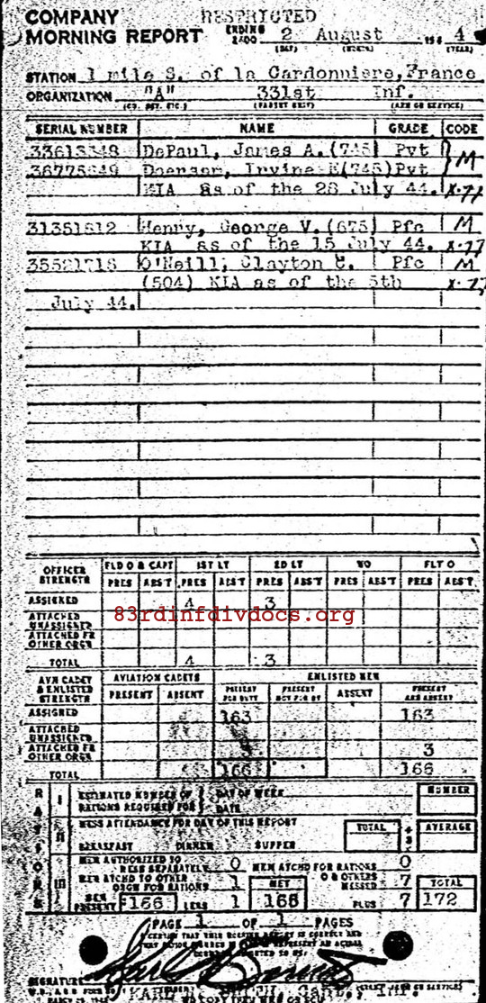 The morning report confirms this. Private DePaul was a member of A Company. The morning report for July 22, 1944 on page 43 and 44 lists him joining the unit from the 48th Replacement Battalion on July 20, 1944 while holding the rank of Private. The morning report for August 2, 1944 on page 7 lists him as killed in action on July 28, 1944. The pages can be seen below. |