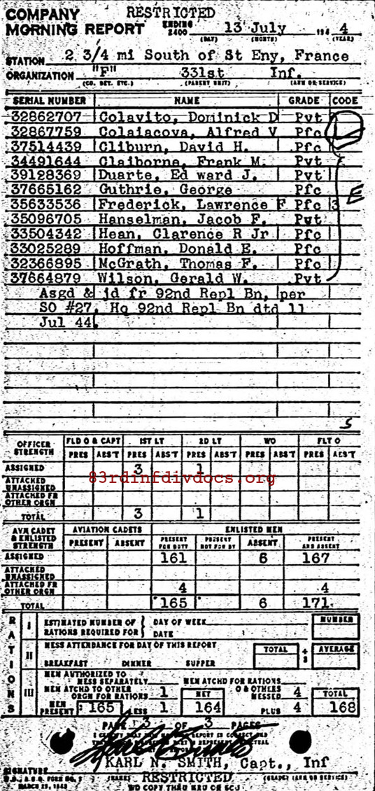 | 1944-07-13 | PVT | Assigned and joined from 92nd Replacement Battalion as of July 13, 1944 | F / 331 | view page | |