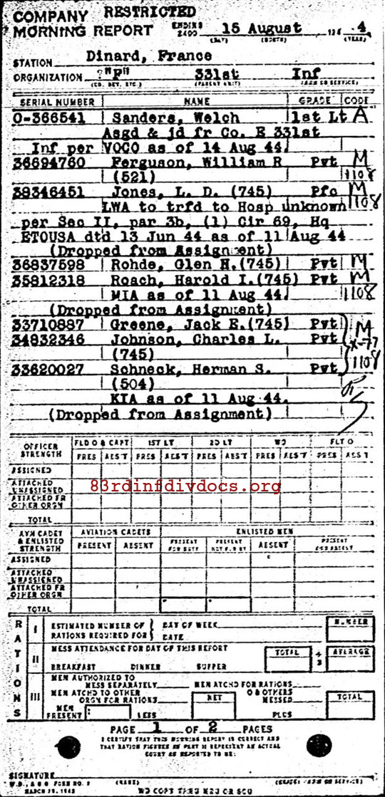 | 1944-08-15 | PVT | Killed in action on August 11, 1944 | 504 | F / 331 | view page |