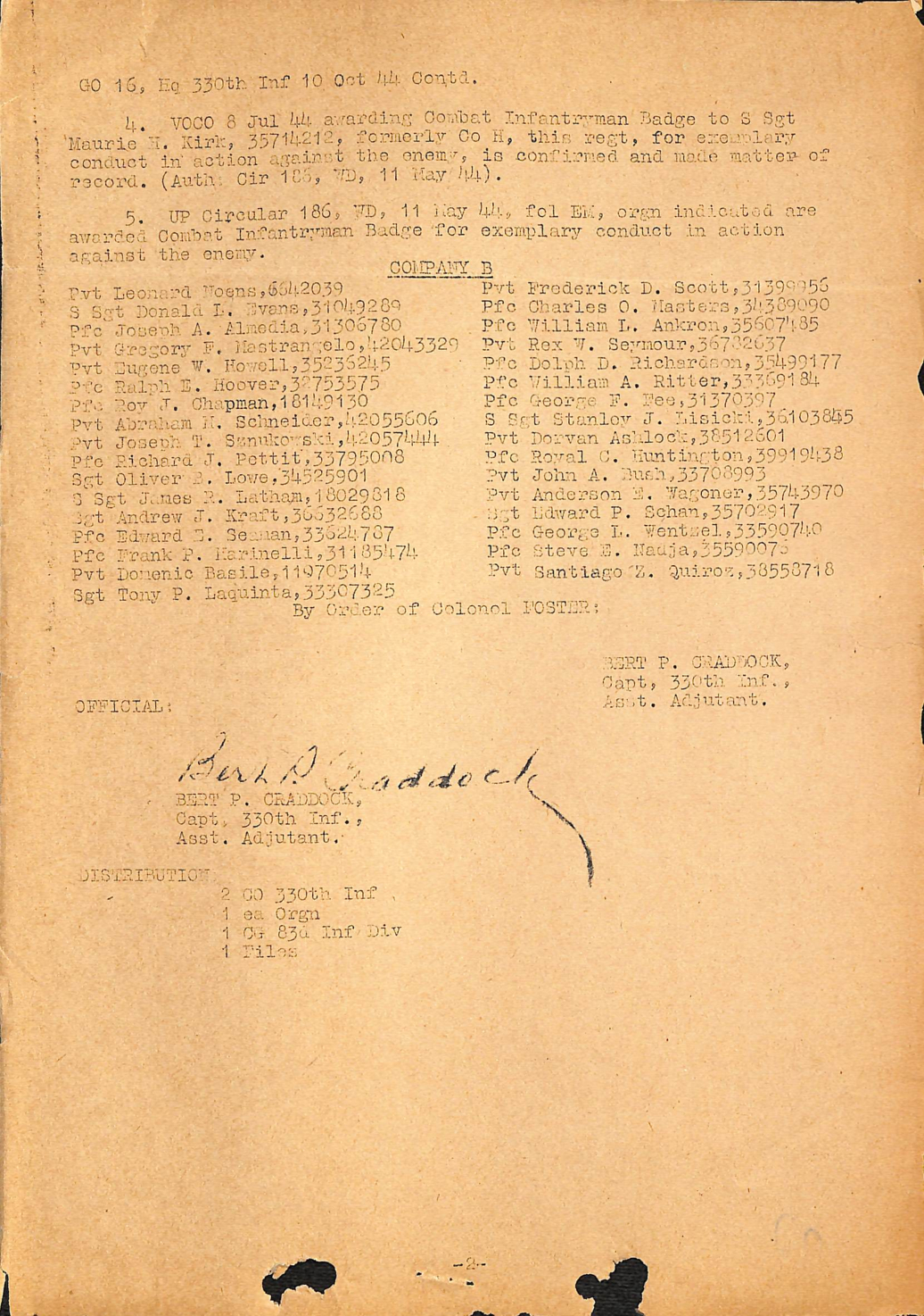 | Unit | B Company, 330th Infantry Regiment, 83rd Infantry Division |