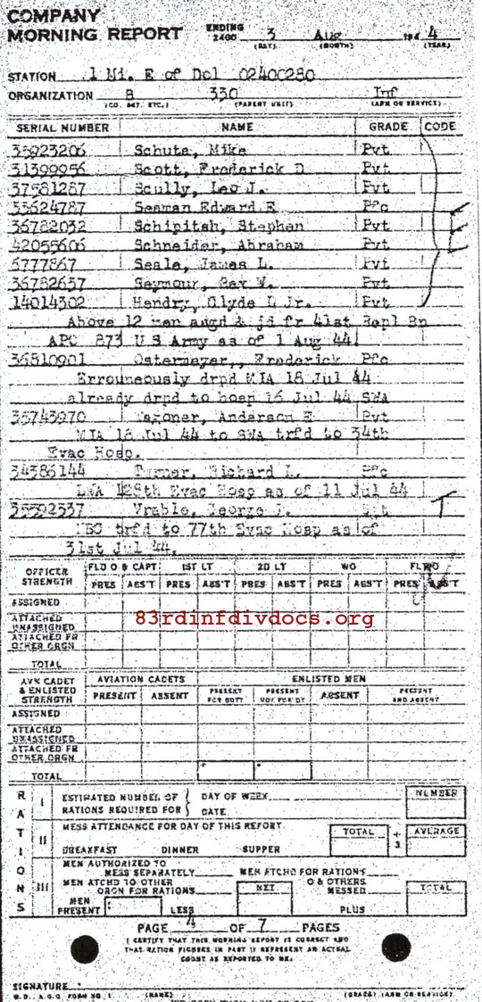 | 1944-08-03 | PFC | Assigned and joined from 41st Replacement Battalion as of August 1, 1944 | B / 330 | view page | |