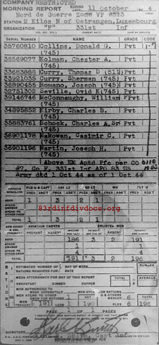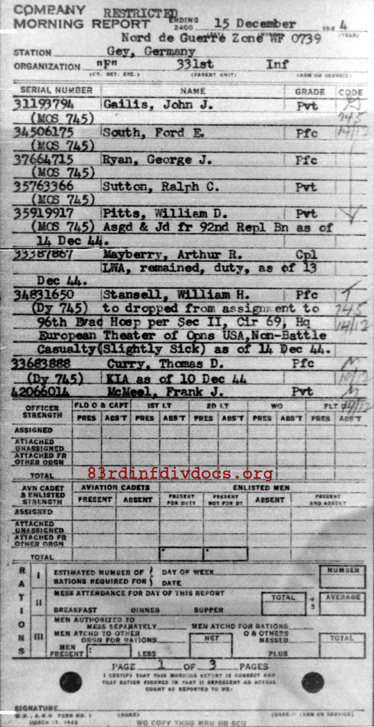 | The 331st Casualty Report (page 2, #57) for 1944 lists Pfc. Curry as member of F Co.