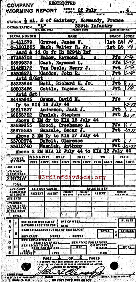 | Private First Class De Bolt was a member of L Company. The morning report for July 20, 1944 on page 62 lists him as missing in action on July 12, 1944. Page 71, for July 22, 1944 changes his status from missing in action to killed in action. All relevant pages can be seen below. |