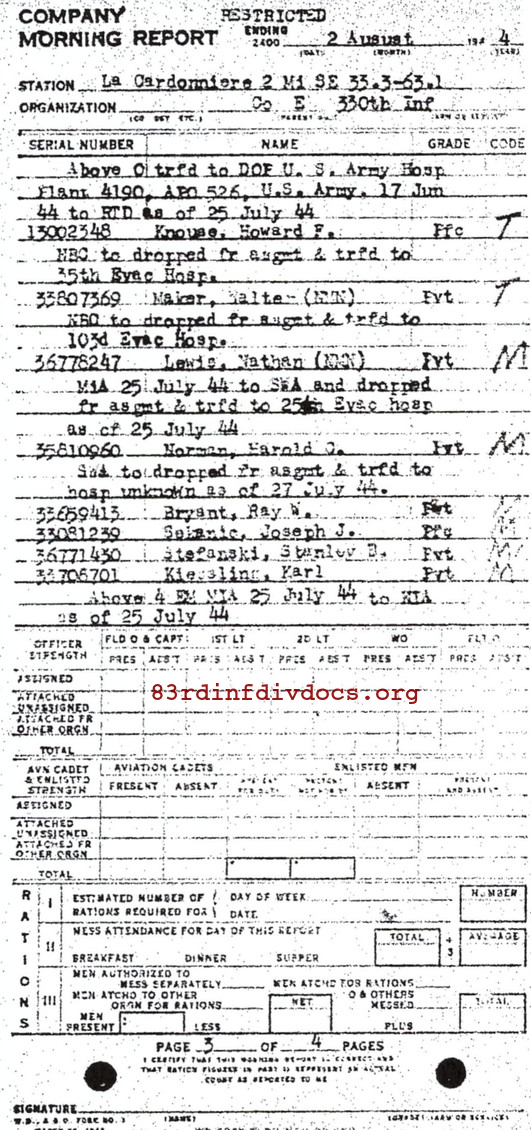 | Private Kiessling was a member of E Company. The morning report for July 11, 1944 on page 19 lists him joining the unit from the 48th Replacement Battalion on July 7, 1944. Page 68, for July 31, 1944, lists him as missing in action as of July 25, 1944. The morning report for August 2, 1944 on page 4 lists his status changed to killed in action on July 25, 1944. The pages can be seen below. |