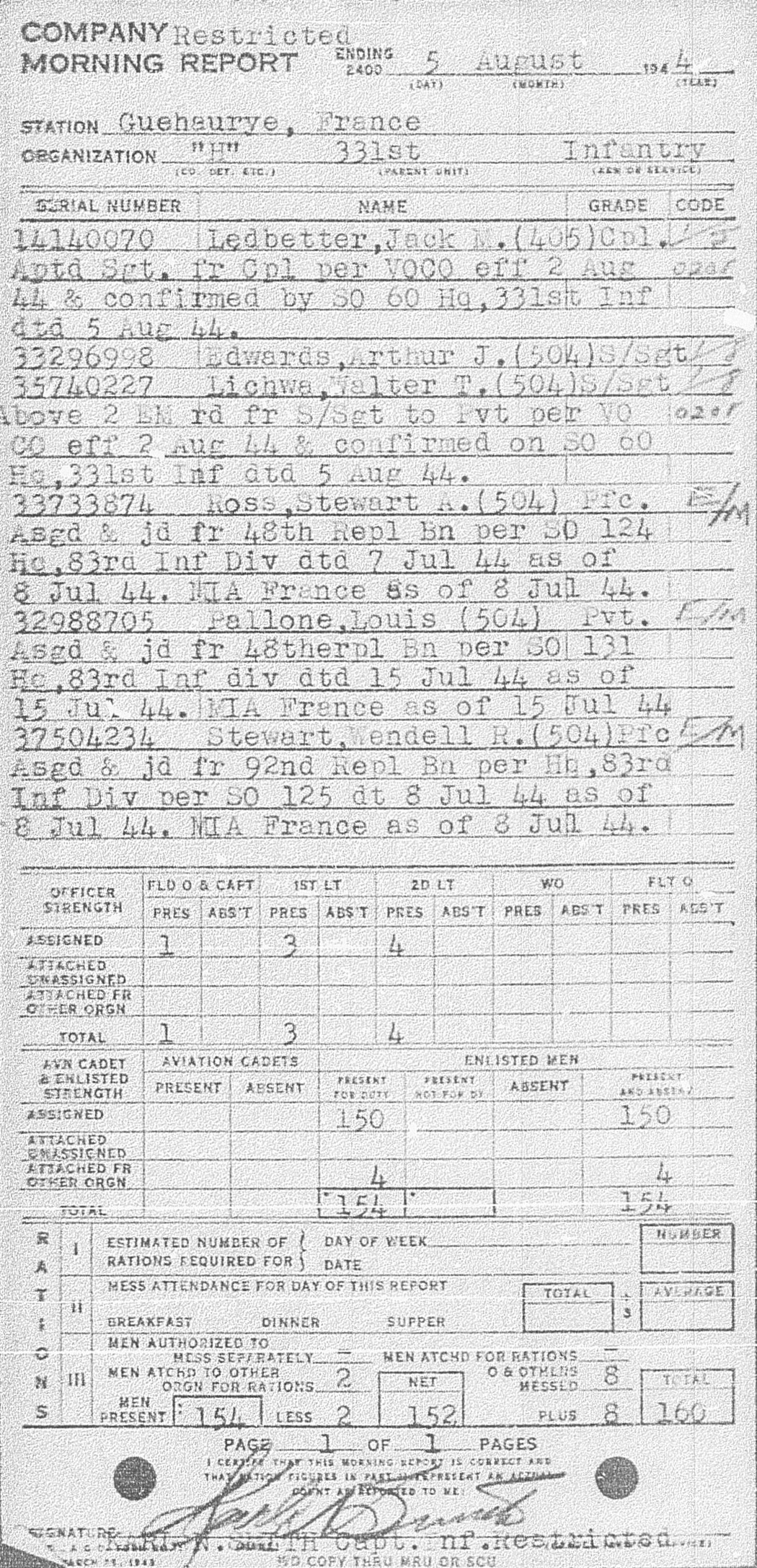 | 1944-08-05 | PFC | Missing in action as of July 8, 1944 | 504 | H / 331 | view page |