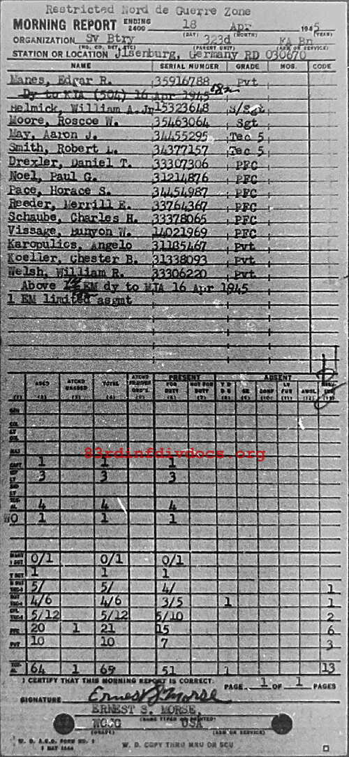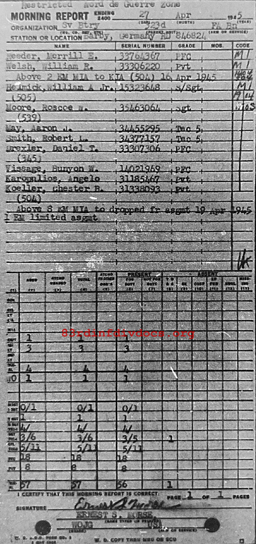 Private Merrill E. Reeder, 33764367 was assigned to C Battery 861st FA Bn , 63d Infantry Division at Camp Van Dorn, MS on 19 September 1943 about the same time as I was assigned to the 63d Infantry Division. He was reassigned from the 63rd Infantry Division on 7 February 1944 and went to the 83rd Infantry Division as a replacement.