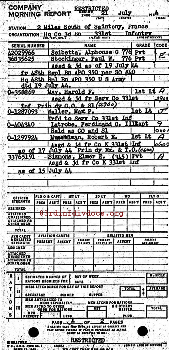 | 1944-07-20 | PVT | Transferred to HQ Company, 3rd Battalion, 331st Infantry Regiment as of July 15, 1944 | 345 | K / 331 | view page |