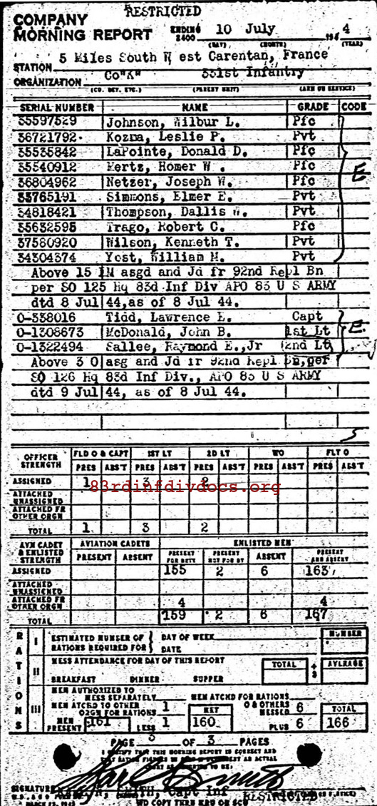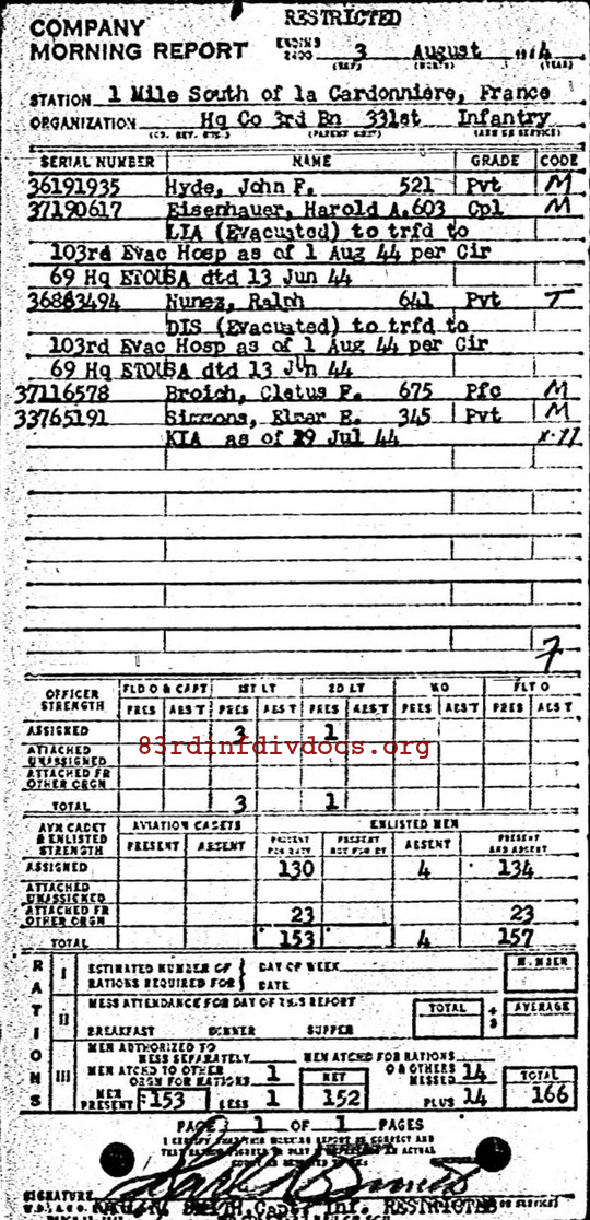 | 1944-08-03 | PVT | Killed in action on July 29, 1944 | 345 | HQCO3BN / 331 | view page |