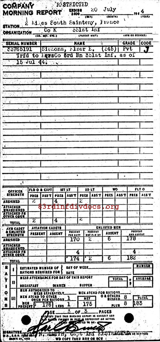 | 1944-07-21 | PVT | Assigned and joined from K Company, 331st Infantry Regiment as of July 15, 1944 | 345 | HQCO3BN / 331 | view page |