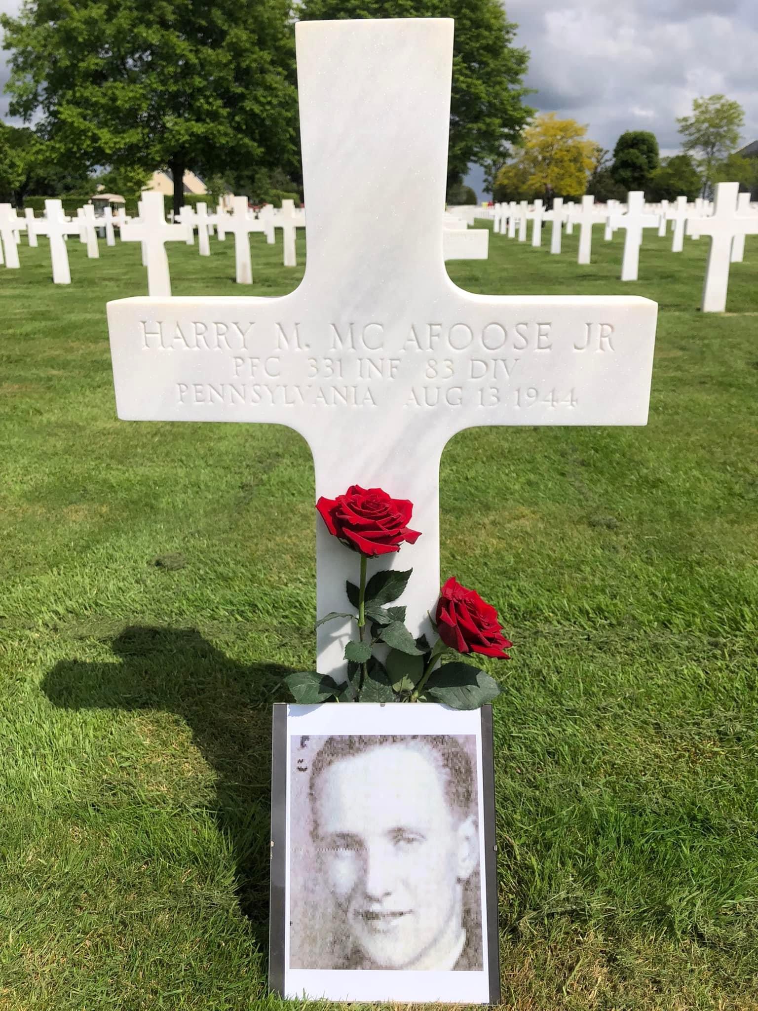 | Erwin Derhaag pointed me to a newspaper article from The Indiana Gazette - 5 September 1944. From this article partially quoted: Word has been received by Mrs. H. Miles McAfoose, that her husband, Private Miles McAfoose, had been killed in action in France, August 13th. He was serving with the US Infantry. The deceased entered the service December 1943 and was sent overseas June 1944. He is survived by his wife Helen Dugan McAfoose and a year old daughter Patricia Ann and his parents, Mr. and Mrs. Harry McAfoose of the corner Thirteenth and Philadelphia street, one brother, William B. of Indiana and one sister, Mrs Carl Smith of New Bethlehem. He was born May 6th, 1917 and was home on his birthday May 6th for his last furlough. He was graduated from the Indiana High School, and was employed by the McCreery Tire and Rubber Co. before being drafted. He was first sent to Camp Walters, Texas and later to Camp George Mead e, MD. It is thought he landed in England the end of June. The article can be seen below. |