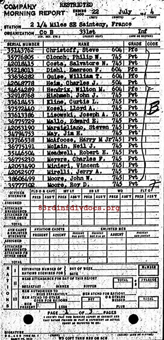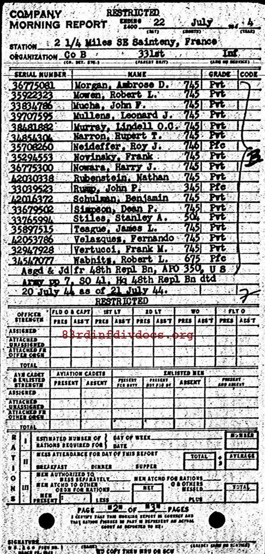 | 1944-07-22 | PVT | Assigned and joined from 48th Replacement Battalion as of July 21, 1944 | 745 | B / 331 | view page |