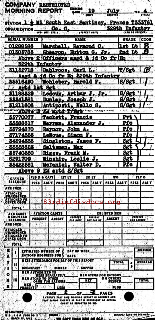 | Staff Sergeant Raynor was a member of G Company. The morning report for July 19, 1944 on page 49 lists his promotion from Private First Class to Staff Sergeant. The page can be seen below. Since we have no later documents we assume that Staff Sergeant Raynor died while serving in G Company. |