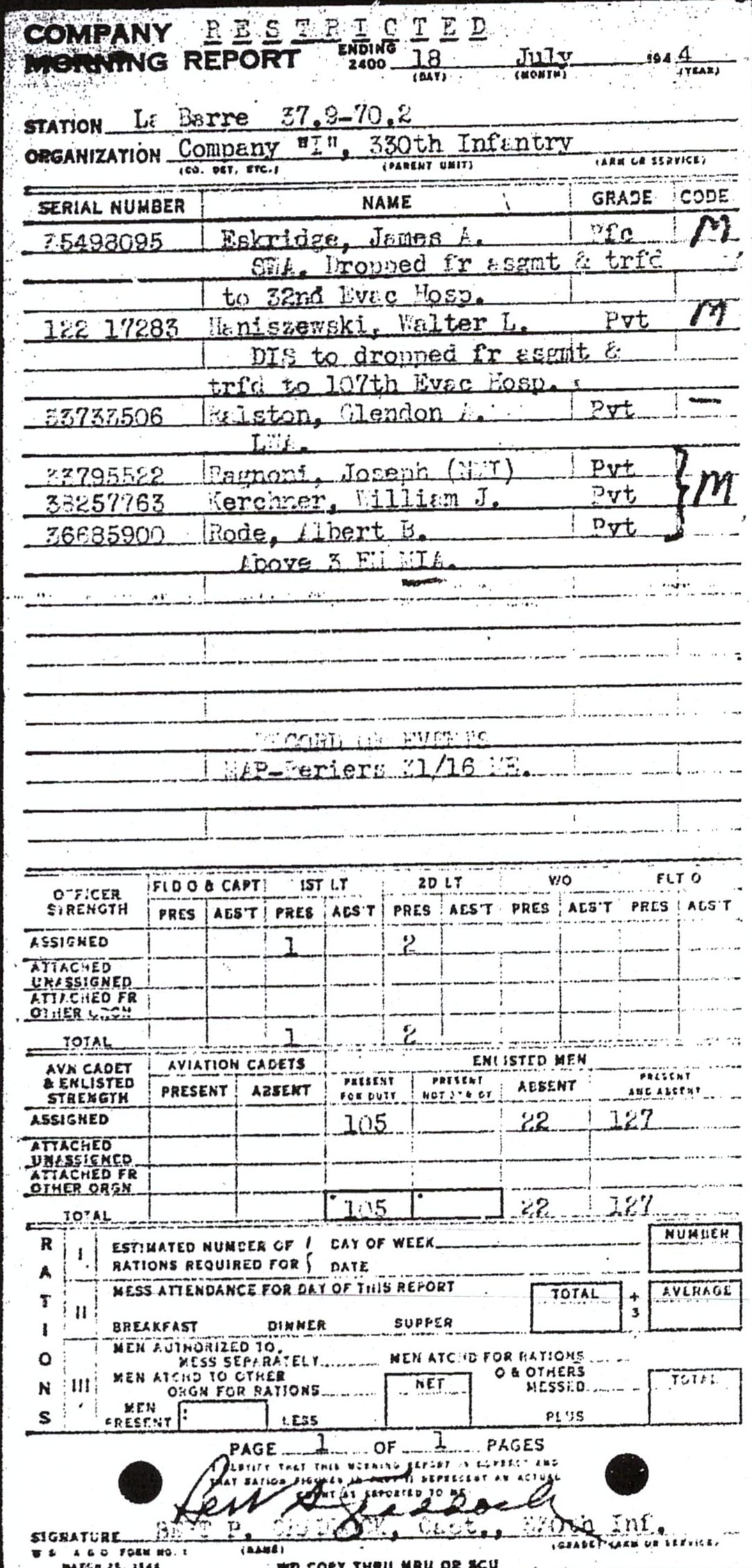 | 1944-07-18 | PVT | Missing in action as of July 18, 1944 | I / 330 | view page | |