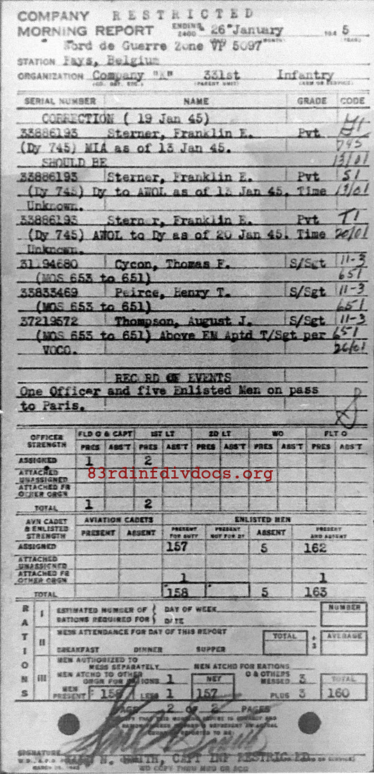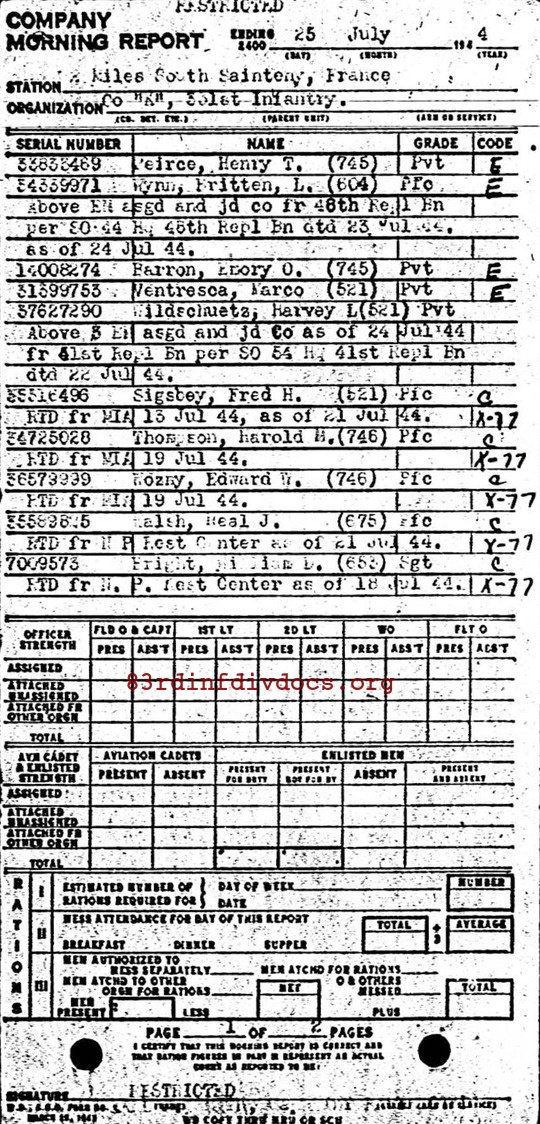 | 1945-01-26 | SSGT | Promoted to Technical Sergeant, duty changed to Platoon Sergeant (651) as of January 26, 1945 | 653 | K / 331 | view page |