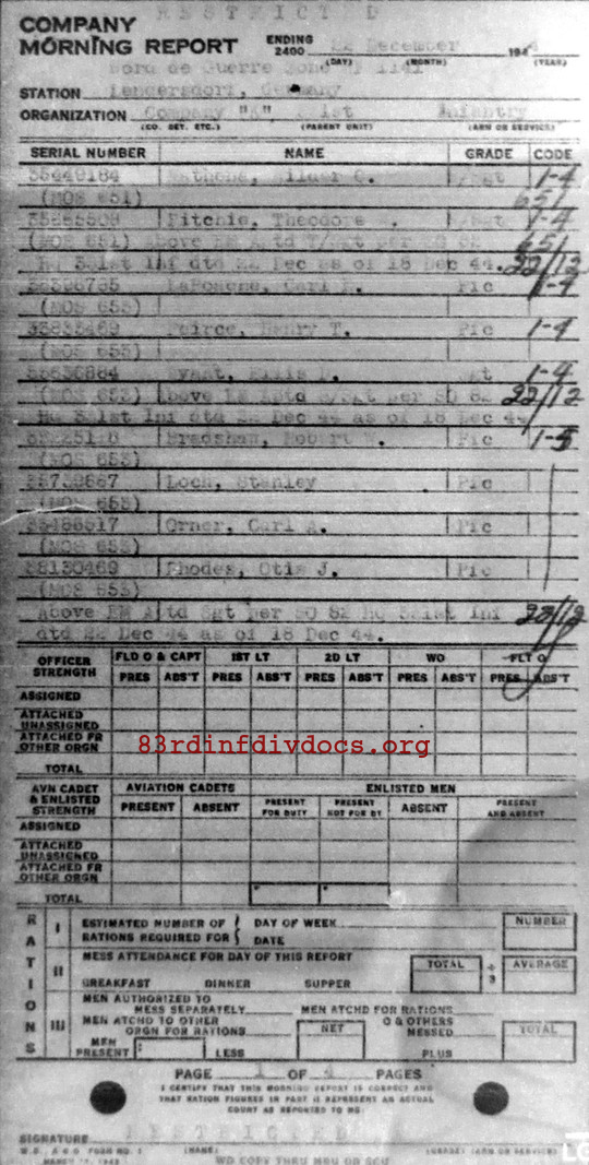 | 1944-12-22 | PFC | Promoted to Staff Sergeant, duty changed to Squad Leader (653) as of December 18, 1944 | K / 331 | view page | |