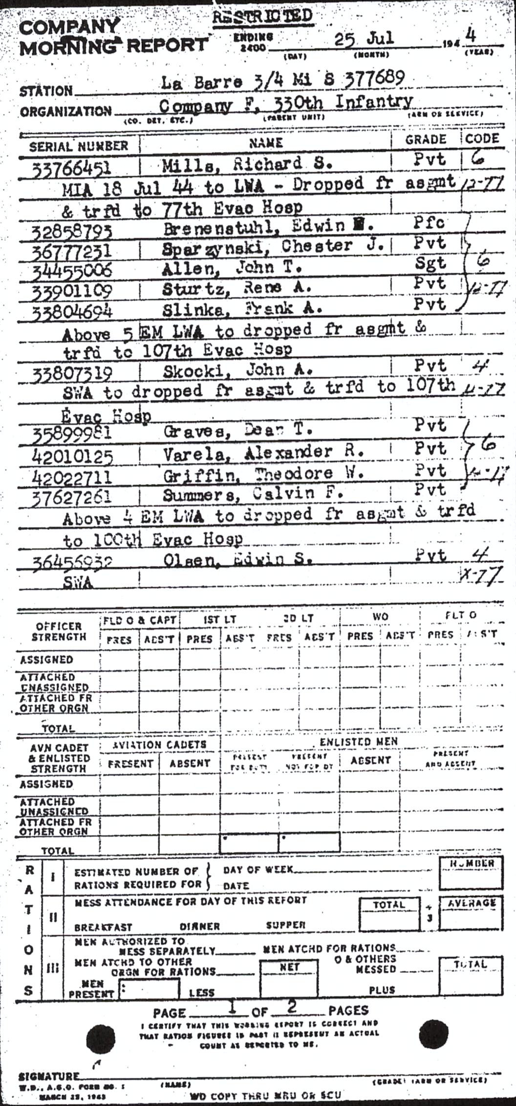 | 1944-07-25 | PVT | Lightly wounded in action and transferred to 107th Evacuation Hospital on July 25, 1944 | F / 330 | view page | |
