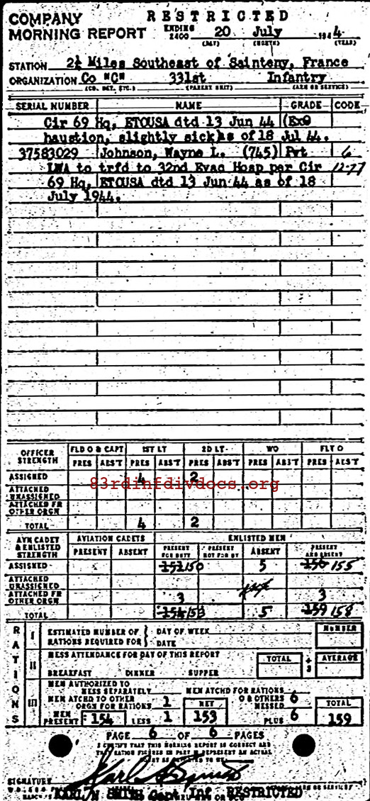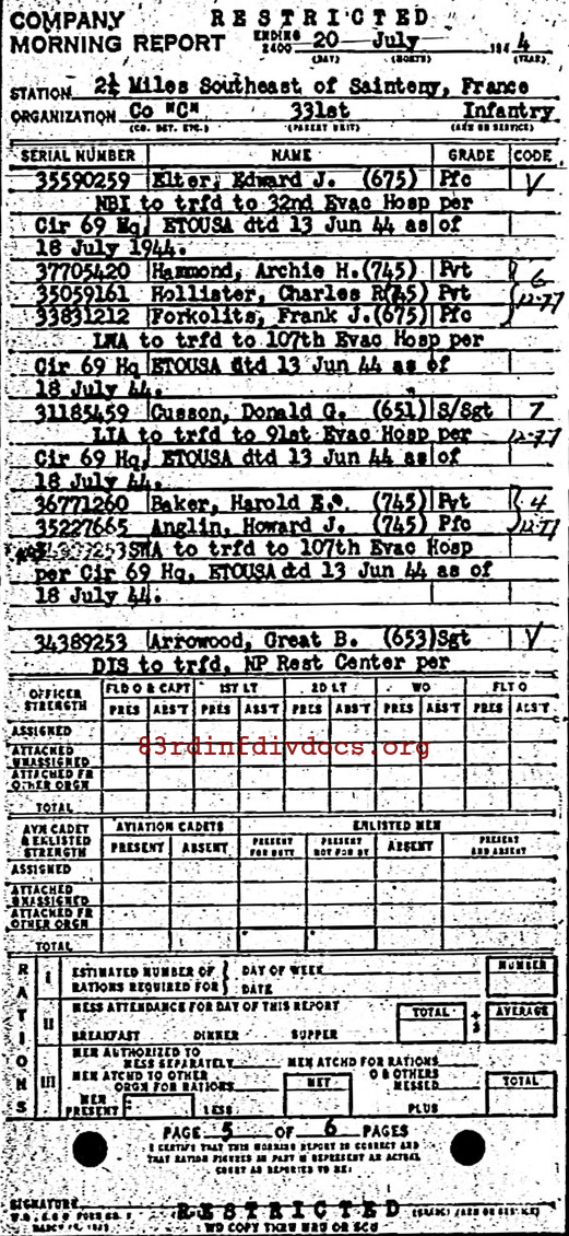 | 1944-07-20 | SGT | Non battle casualty and transferred to NP Rest Center on July 18, 1944 | 653 | C / 331 | view page |