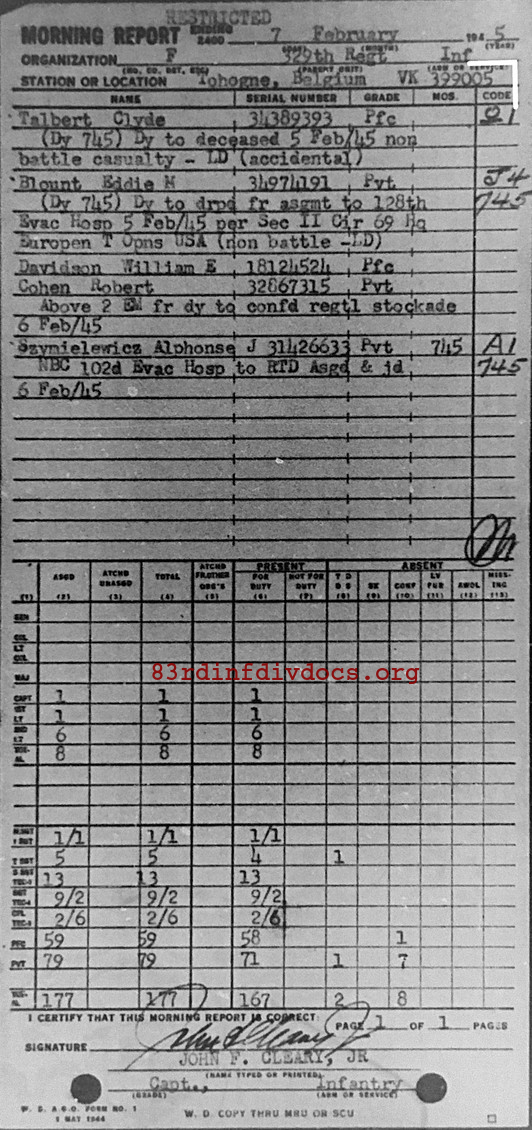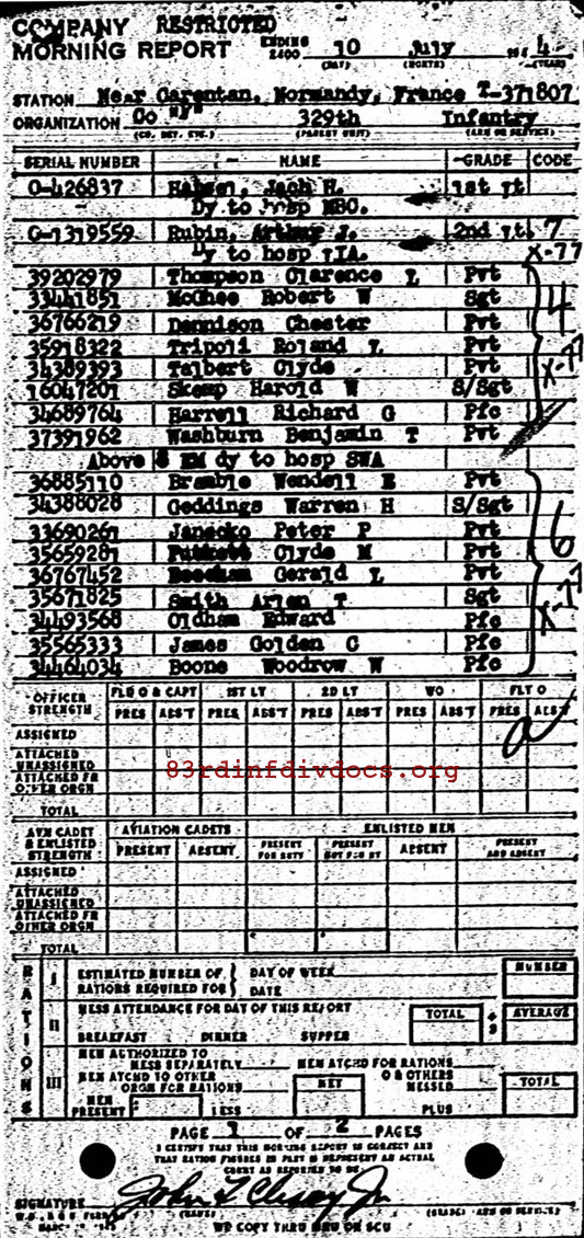 | Private First Class Talbert was a member of F Company. The morning report for July 10, 1944 on page 20 lists him as severely wounded in action while holding the rank of Private. Page 22, for July 11, 1944 corrects the previous page as transferred to evacuation hospital. All pages can be seen below. Since we have no later documents we assume that Private First Class Talbert died while serving in F Company. |
