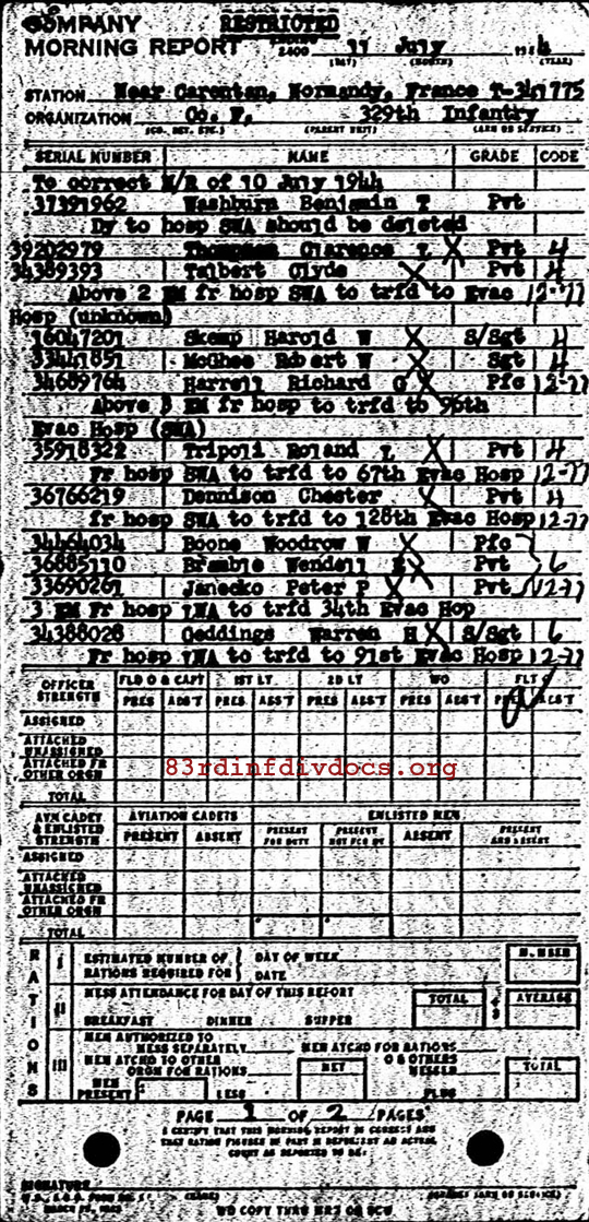 | 1944-07-10 | PVT | Severely wounded in action and duty to hospital on July 10, 1944 | F / 329 | view page | |