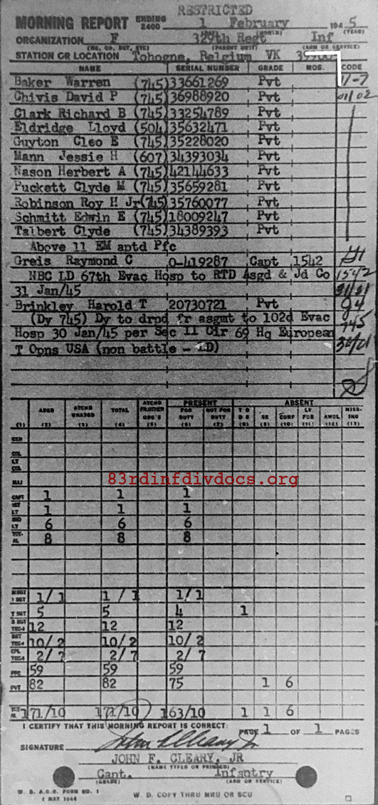 | Unit | F Company, 329th Infantry Regiment, 83rd Infantry Division |