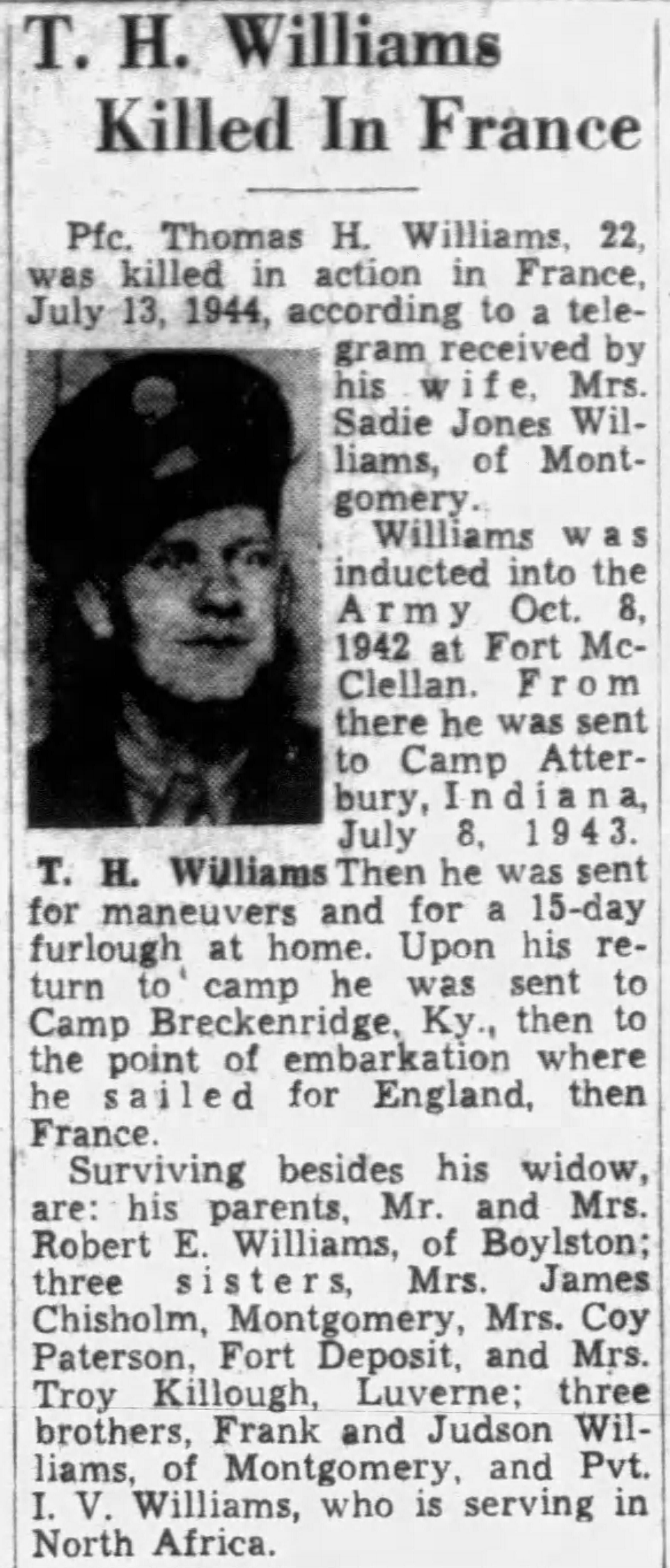 | According to page 12 of the memoirs of Capt. Harry C. Gravelyn, Co. D, 331st, Pfc Thomas Williams was an original member of that outfit. This is confirmed by the 331st Casualty Report (page 4, #129) for 1944. This report also lists Pfc. Williams as member of D Co. |