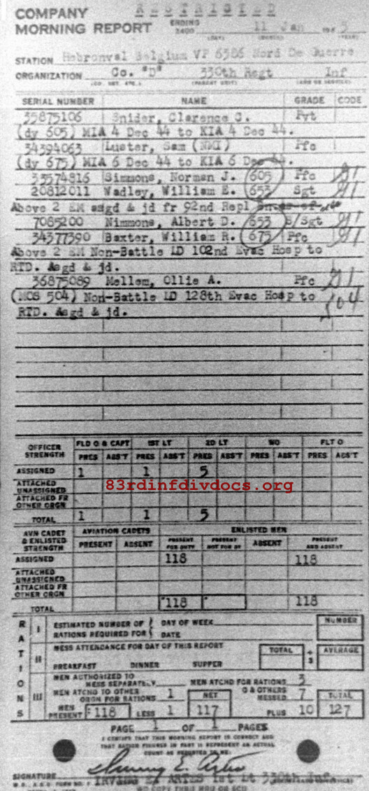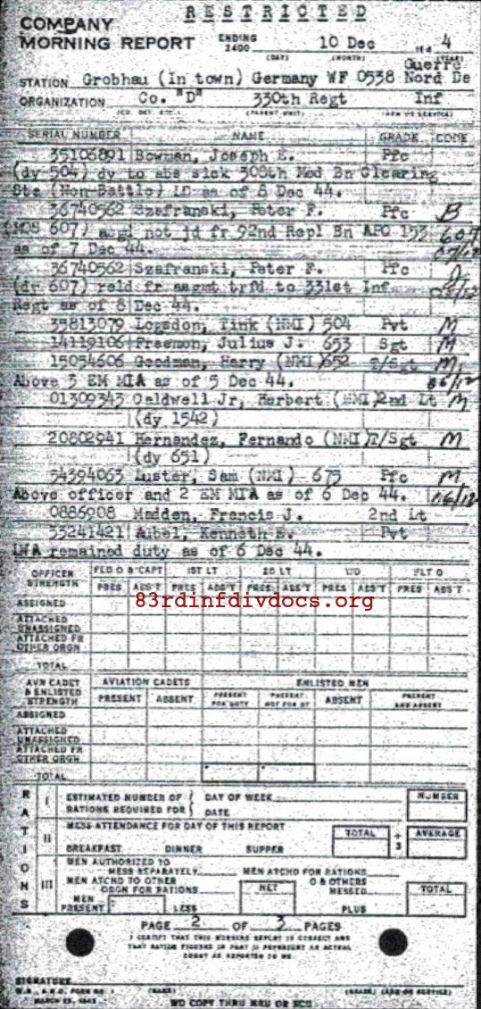 | Private First Class Luster was a member of D Company. The morning report for December 10, 1944 on page 13 lists his status changed to missing in action on December 6, 1944. The page can be seen below. |