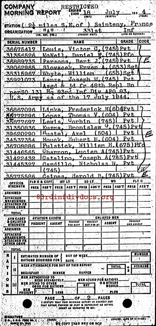 | 1944-07-18 | PVT | Assigned and joined from 41st Replacement Battalion as of July 17, 1944 | 604 | A / 331 | view page |