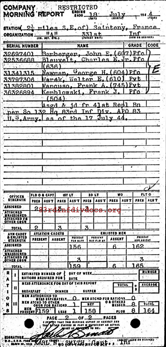 | Unit | A Company, 331st Infantry Regiment, 83rd Infantry Division |
